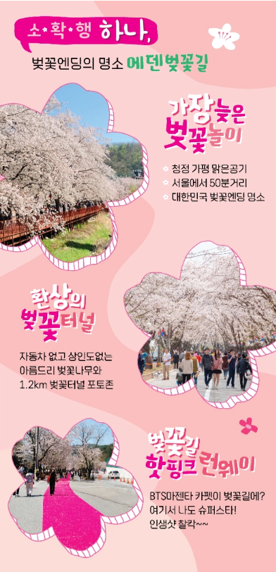 비교적 기온이 낮은 경기 북동부에 위치하여 국내에서 가장 늦게 만개하여 여유롭게 만날 수 있는 벚꽃의 향연, 에덴벚꽃길 벚꽃축제. 주말 가족, 연인, 친구들과 꼭 방문해서 소중한 추억 만들어 보세요~!