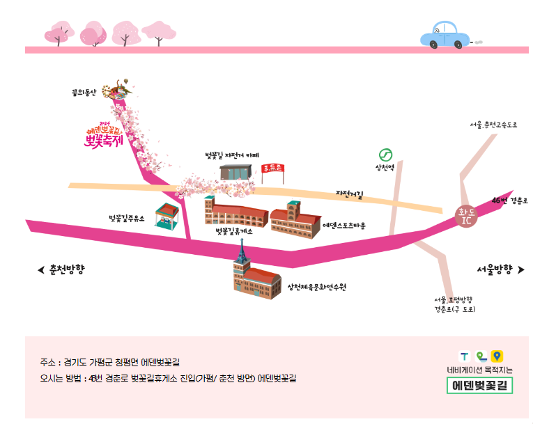 - 오시는 방법 : 46번 경춘로 벚꽃길휴게소 진입(가평/ 춘천 방면) 에덴벚꽃길