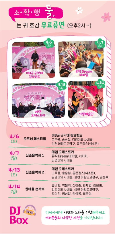 - 4월 14일(일) : 에덴벚꽃길 벚꽃축제 한마음 콘서트 (14:00~17:00)