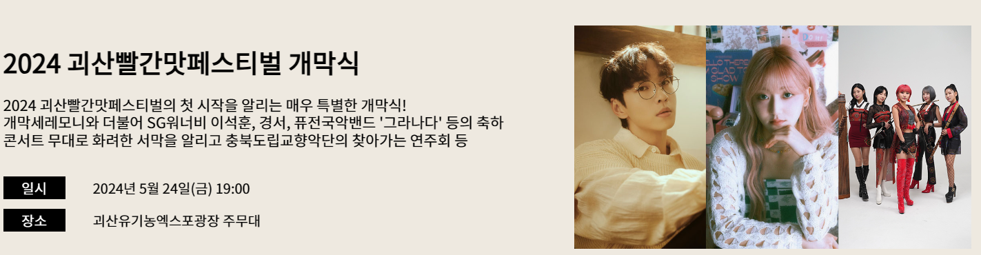 충북 괴산의 대표 축제로는 고추축제와 김장축제가 있는데요, 올해는 특별하게 2024 괴산 빨간맛 페스티벌이 처음으로 개최된다고 해요! 이름부터 강렬한 이 트렌디한 괴산의 봄 축제는 벌써부터 많은 기대를 모으고 있습니다. 축제의 기본정보와 출연 가수, 행사장 위치, 1, 2, 3일차 프로그램 일정에 대해 총정리해서 알려드릴게요.