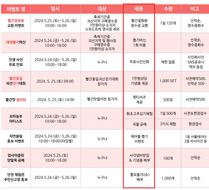 - 빨간맛 컬러런(사전예약) : 25일(토) 14:00 ~ 16:00 [사전예약 바로가기]