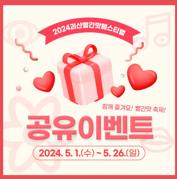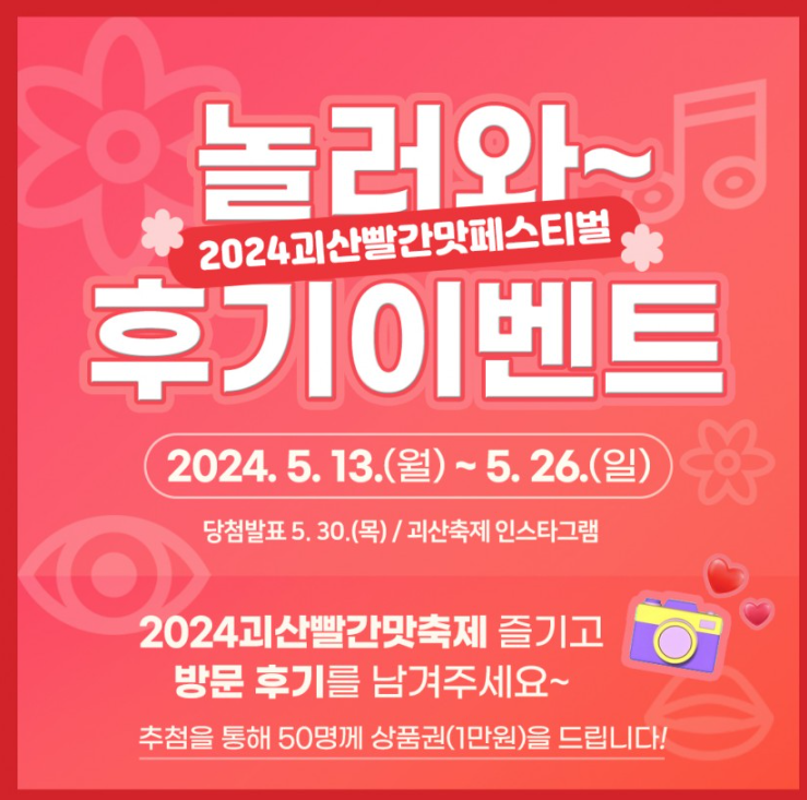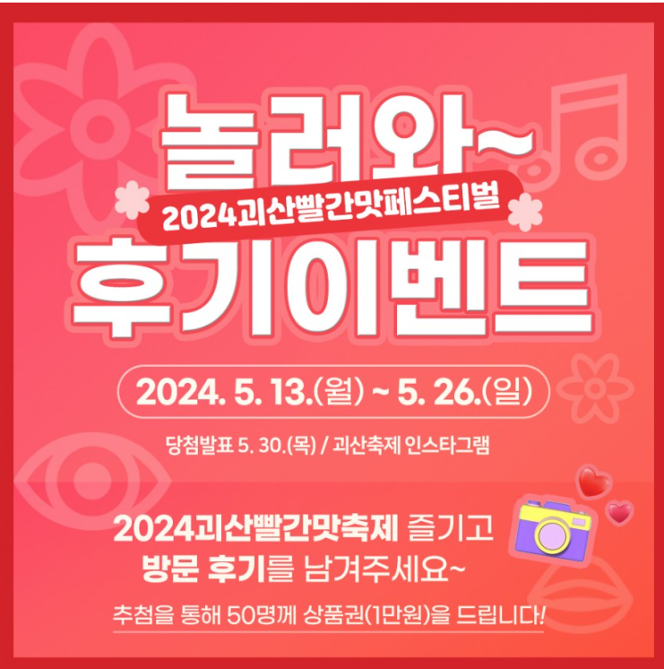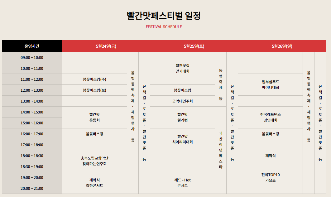 괴산 빨간 페스티벌 출연 가수, 프로그램, 일정표 등 기본정보를 총정리해 보았는데요, 올해 처음으로 개최되는 축제인 만큼 더 신경 써서 준비했을 것 같으니, 봄나들이 겸 꼭 다녀와보시길 바랍니다!