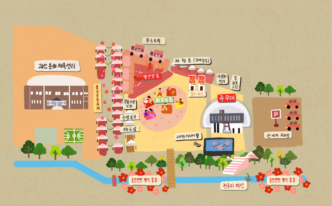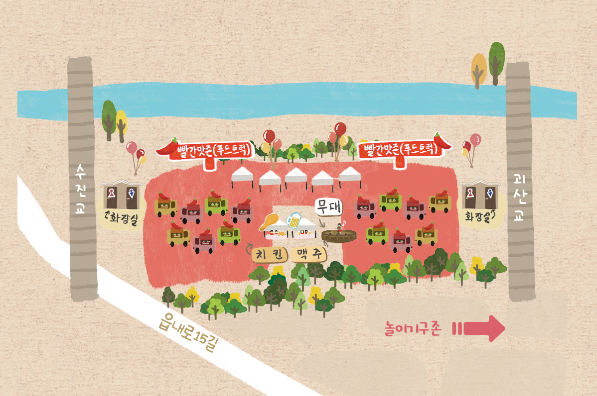 괴산유기농엑스포광장과 동진천변 하상 일대의 행사장 배치도는 괴산문화체육센터 주변이라고 보시면 됩니다. 이미지를 저장해 두셨다가 활용하시면 좋을 것 같아요.
