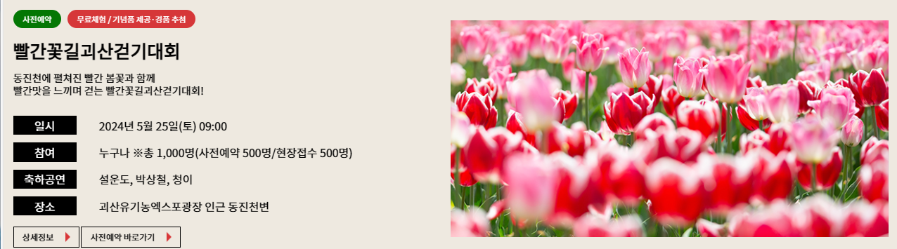 - 빨간꽃길 괴산 걷기대회(사전예약) : 25일(토) 09:00 [사전예약 바로가기]