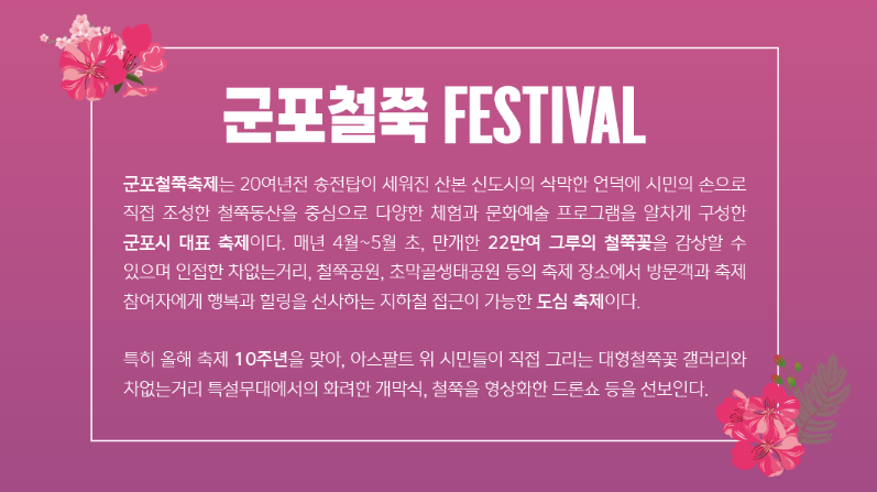 봄이 찾아온다는 소식과 함께, 2024 군포철쭉축제가 다가오고 있습니다! 이 행사는 지역 사람들의 열정과 노력으로 시작되어, 이제는 군포시의 자랑스러운 대표 축제로 자리 잡았습니다.