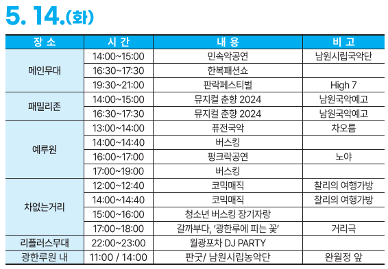 - 토요일(5월 11일) : 주요 공연 및 민속 씨름 대회, 국악대전
