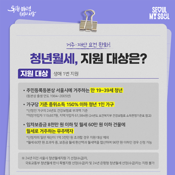 이번 프로그램은 서울에 주민등록이 되어있는 만 19~39세(출생연도 1984~2005년) 무주택 청년 1인 가구 중 기준중위소득 150% 이하인 분들을 대상으로 합니다. 여기에 차량시가표준액 2,500만 원 이상 차량 소유자와 공공임대주택 거주 청년 등은 제외됩니다.