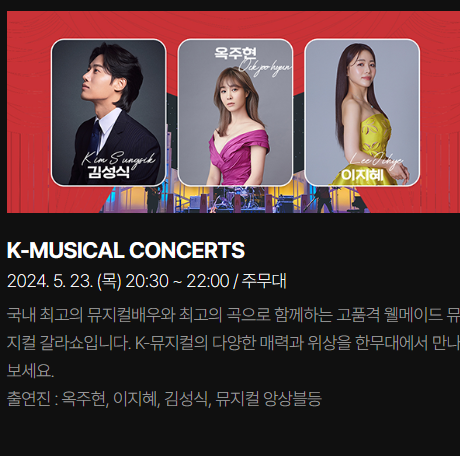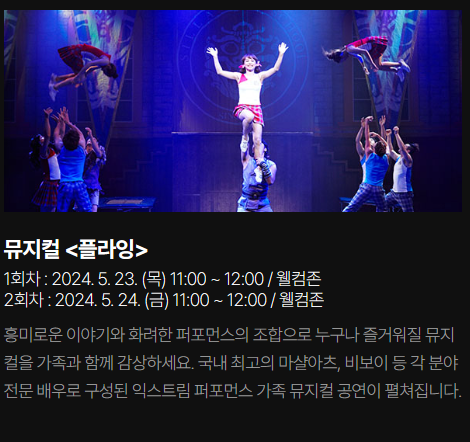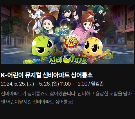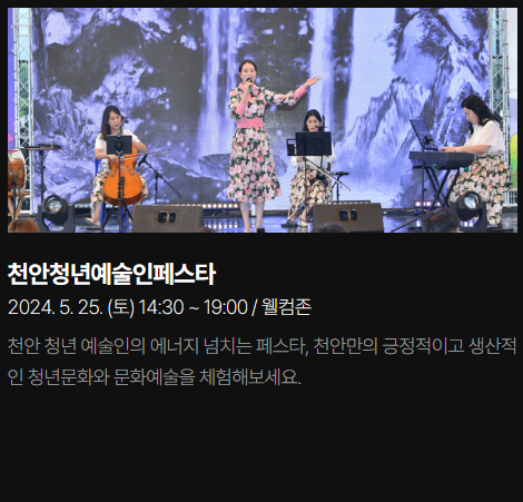 - 천안 K-컬처 박람회는 다양한 장르의 공연과 특별 이벤트가 준비되어 있어 가족 단위 방문객들도 즐길 수 있는 풍부한 콘텐츠를 구성하였으며 특히, 어린이 뮤지컬 <플라잉>, 신비아파트 싱어롱쇼 같은 아이들을 위한 프로그램도 눈에 띕니다. 이렇게 멋진 라인업의 공연을 무료로 즐길 수 있다니, 정말 놓칠 수 없는 기회죠? 여러분도 이 기회를 놓치지 마세요!