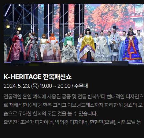 - 특별 프로그램 : 뮤지컬 콘서트, 한복패션쇼