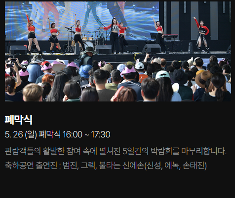 - 이날 폐막식에서는 범진, 그렉, 불타는 신에손(신성, 에녹, 손태진)이 멋진 공연으로 박람회를 마무리합니다.