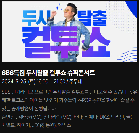 | 천안 K컬쳐 박람회 '두시탈출 컬투쇼 슈퍼콘서트' 사전 좌석 예매 안내 (0) | 2024.05.14 |