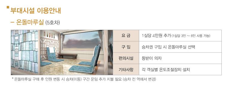 - 온돌마루실은 5호차에 9칸이 있으며, 온돌바닥에 좌식의자가 있고 방마다 온도조절장치가 있어 따뜻하게 이용할 수 있습니다.