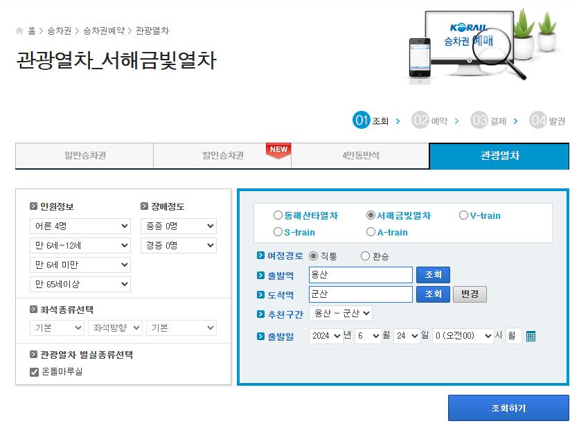 - 서해금빛열차 좌석을 조회하려면, 레츠코레일 홈페이지에서 일반 승차권이 아닌 관광열차 탭으로 들어가셔야 합니다. 인원 정보에 성인 3인 이상을 설정하고, 아래 온돌마루실에 체크한 뒤 검색해야 온돌마루실을 검색할 수 있습니다. 이렇게 하지 않으면 일반실 좌석만 나옵니다.
