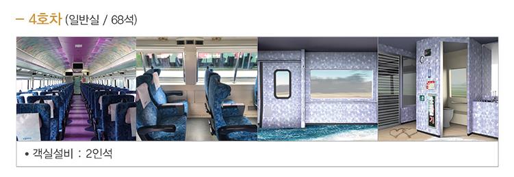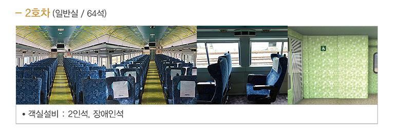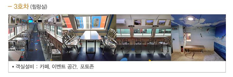 - 열차는 총 5량으로 구성되어 있으며, 그 중 5호차에 온돌마루실이 9실 있습니다. 3호차에는 힐링실이라는 카페 같은 공간이 있으며, 준비해 온 음식을 먹을 수 있는 공간도 마련되어 있어, 일반실 승객도 편리하게 이용할 수 있습니다.
