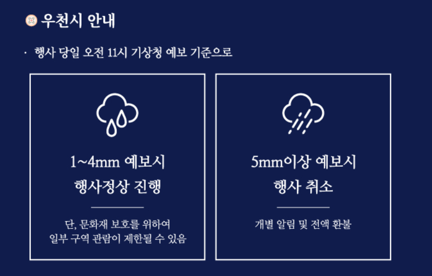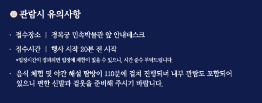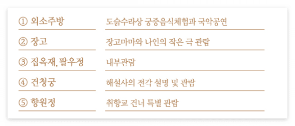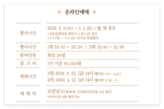 - 휴무: 매주 월, 화요일 휴무 및 4월 26일(궁중문화축전 개막식)