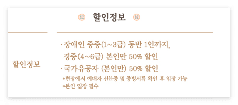 - 국가유공자 및 장애인 : 티켓 가격 50% 할인 (30,000원)