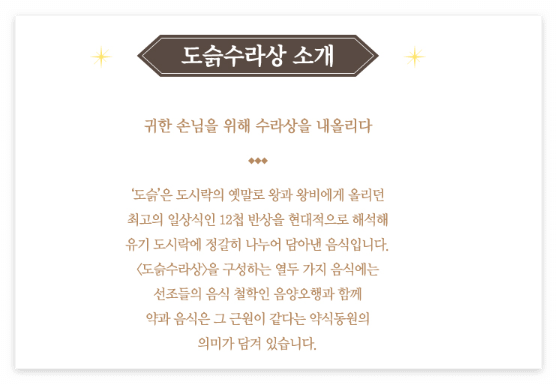 - 도슭수라상 : 옛날 왕과 왕비에게 올리던 수라상을 현대식으로 재해석한 메뉴에요. 총 12첩 반상으로 구성되어 있어서, 그만큼 다양한 약과 음식을 맛볼 수 있답니다. 이 수라상은 약과 음식이 함께 나오는데, 이는 약식동원의 의미를 담고 있어요. 일반메뉴와 채식 메뉴: 이 특별한 수라상은 일반메뉴와 채식 메뉴 두 가지로 제공돼요. 채식을 선호하시는 분들을 위해 채식 메뉴도 따로 준비되어 있답니다.