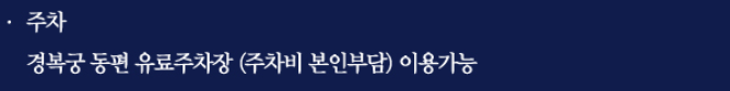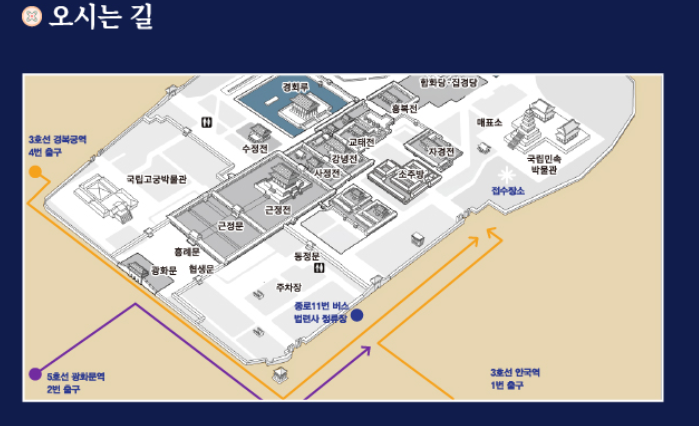 경복궁 주변에 유료 주차장이 있으니 참고하세요. 도보로 이동하실 때에는 경복궁 민속박물관 앞 안내 데스크에서 20분~30분 전에 접수해주세요.