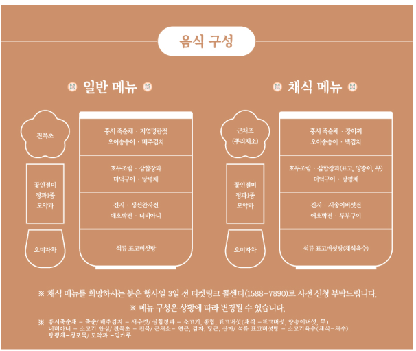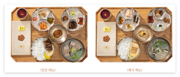 - 총 12첩 반상으로 구성되어 있으며, 메뉴는 일반과 채식 메뉴 두 가지로 제공됩니다.