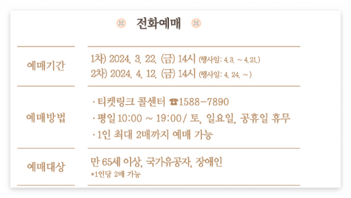 - 전화: 티켓링크 콜센터에서 예약 가능 (65세 이상, 국가유공자, 장애인 전용)