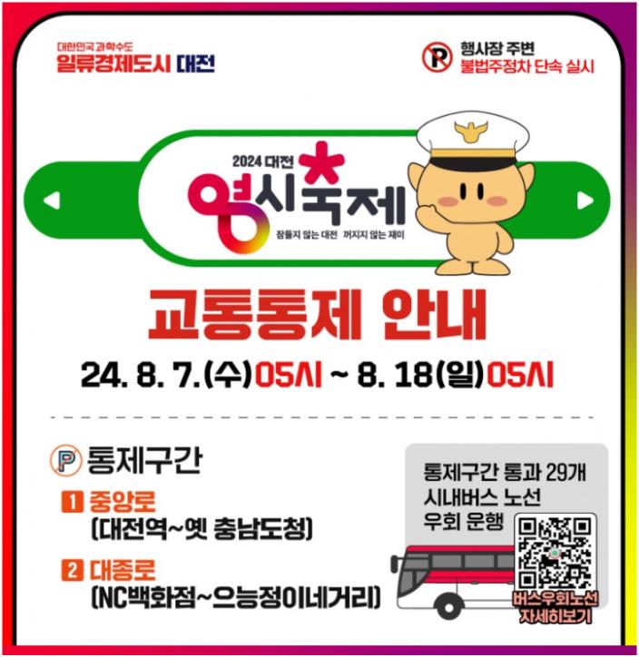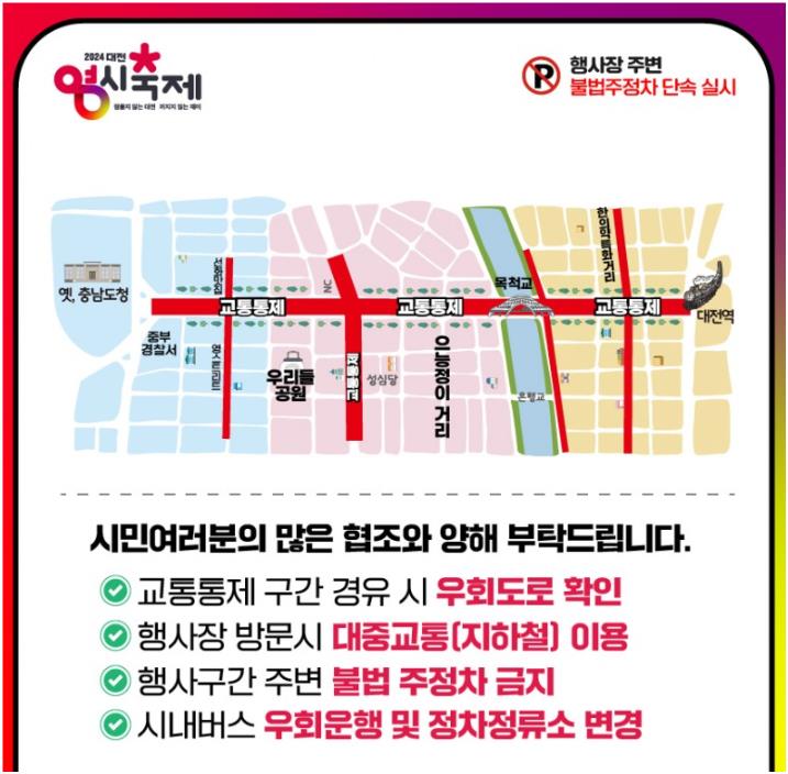 대전 동구 중앙로 일원에서 열릴 예정이며, 대중교통이 잘 갖춰져 있어 타 지역분들이나 도보로 방문하시는 분들에게도 편리한 축제가 될 것입니다. 저렴한 순환버스도 운행되며, 지하철은 오전 1시까지 연장 및 증편 운행됩니다. 축제 기간 동안 일부 구간 교통이 전면 통제된다는 점도 참고해 주세요.