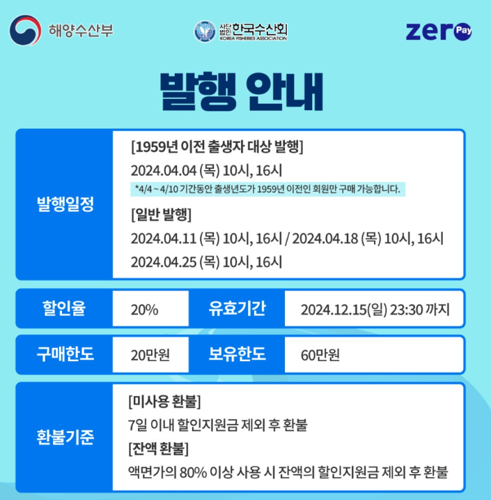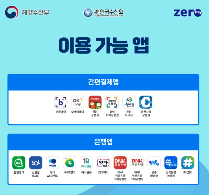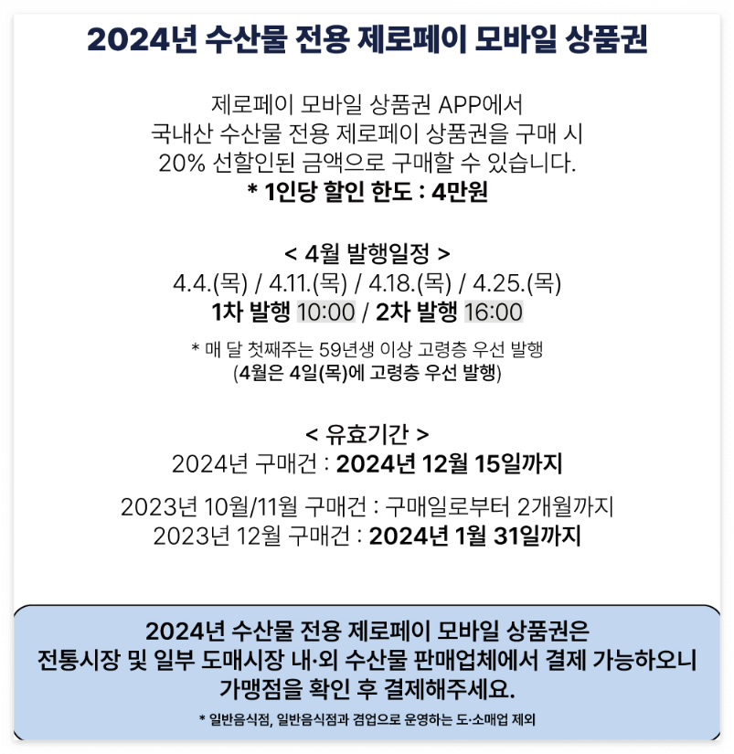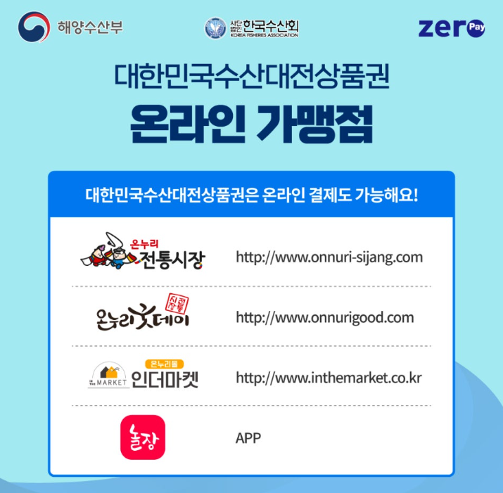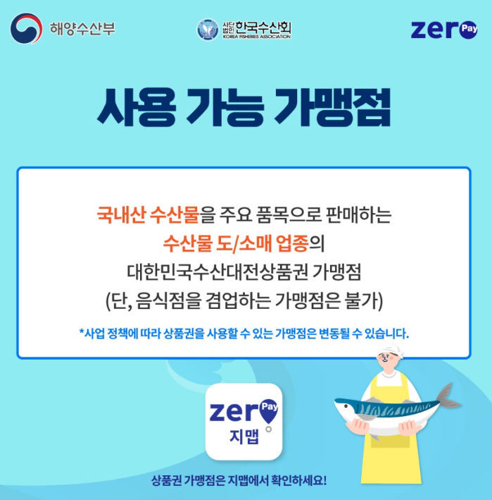 - '2024 수산물 전용 제로페이 모바일 상품권' 사용처는 국내산 수산물을 취급하는 수산물 도/소매 업종의 '대한민국 수산대전 상품권 가맹점'에서 사용이 가능하며 사용 전 가맹점 확인 후 결제 하시기 바랍니다.