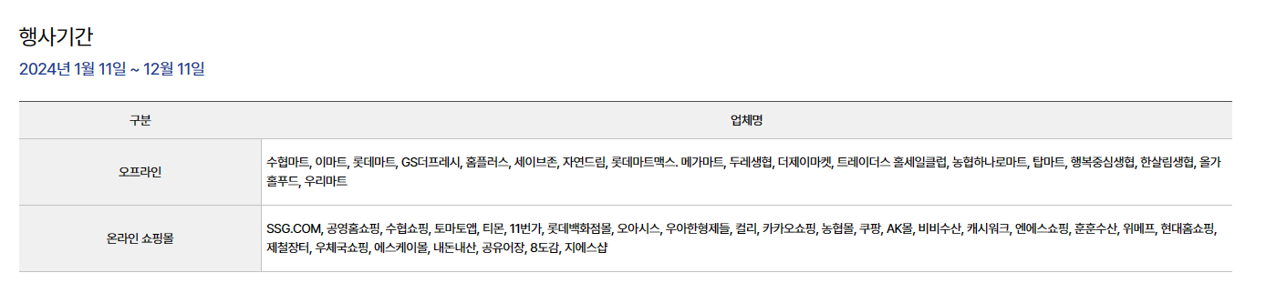 - 온라인 가맹점 : 온누리전통시장, 온누리굿데이, 인 더마켓 온누리몰, 놀장 앱을 통한 온라인 사용도 가능