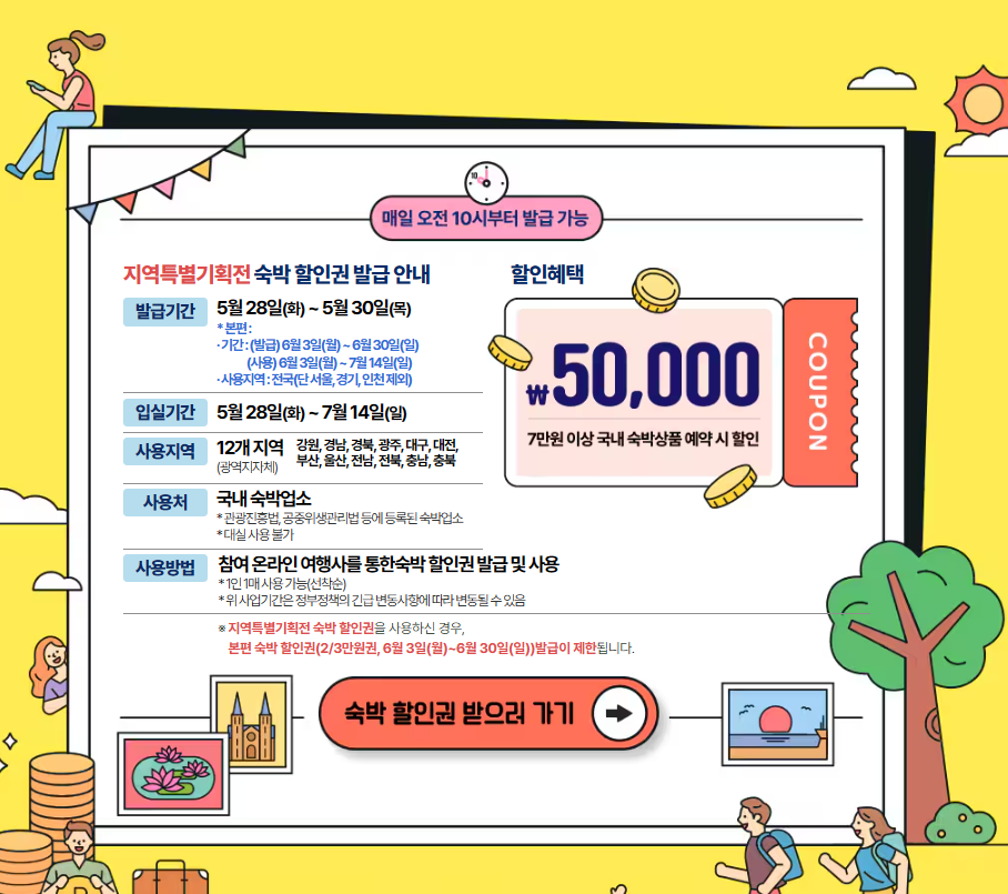 비수도권 지역의 숙박상품을 구매하면 숙박 할인권을 지원하는 행사입니다.