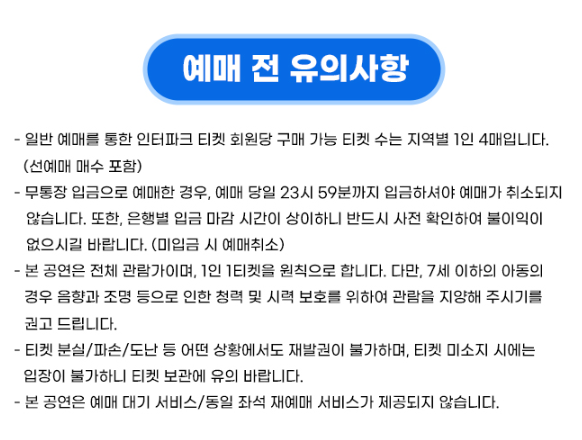 - 티켓은 인터파크 티켓을 통해 구매할 수 있으며, 예매 페이지는 미리 준비해 두는 것이 좋습니다.